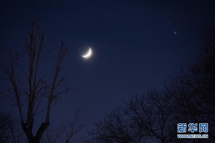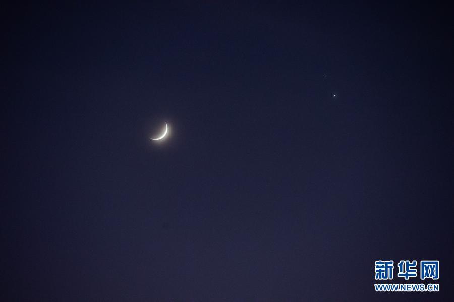 当晚,土星、木星与一轮弯月同时现身夜空,出现“双星伴月”天象。