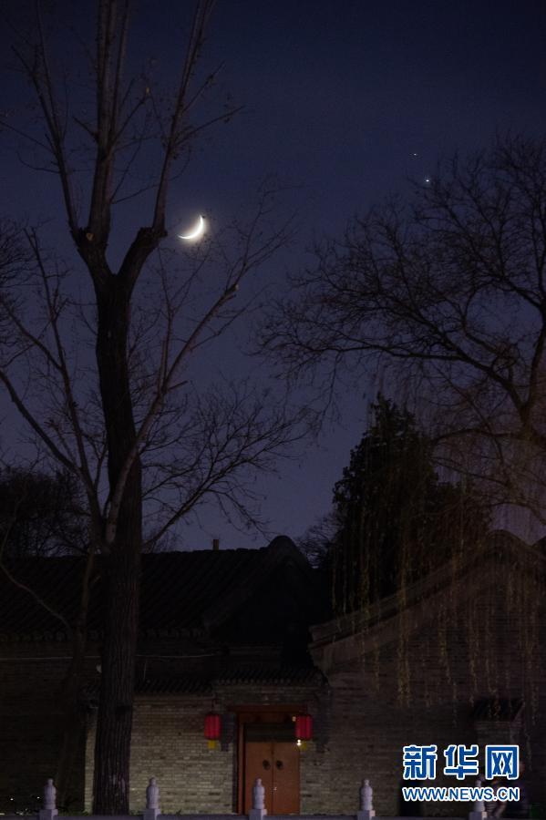 这是12月17日晚在北京什刹海景区拍摄的“双星伴月”。