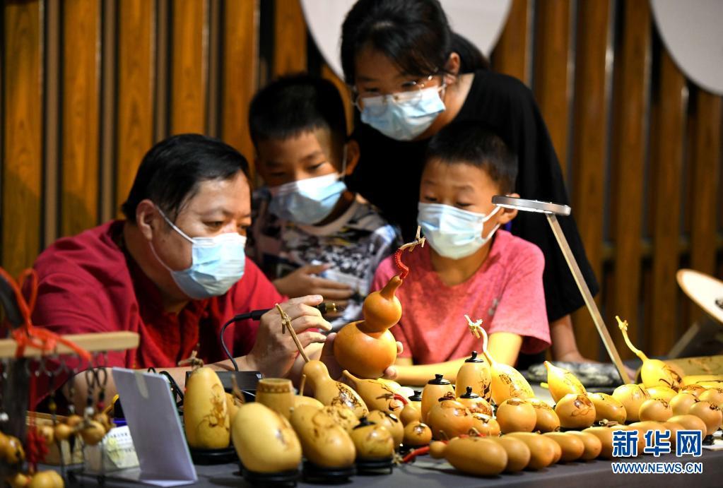8月4日,在河北省石家庄市桥西区冀台联文化产业园,小朋友观看民间艺人在葫芦上烙画。
