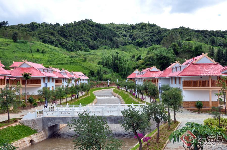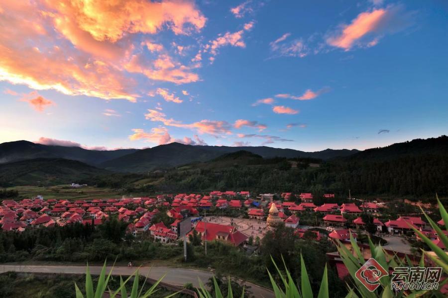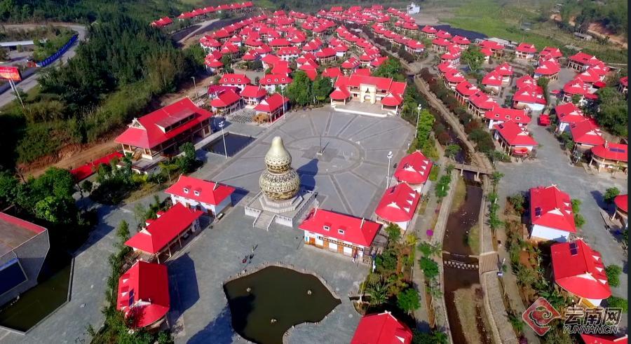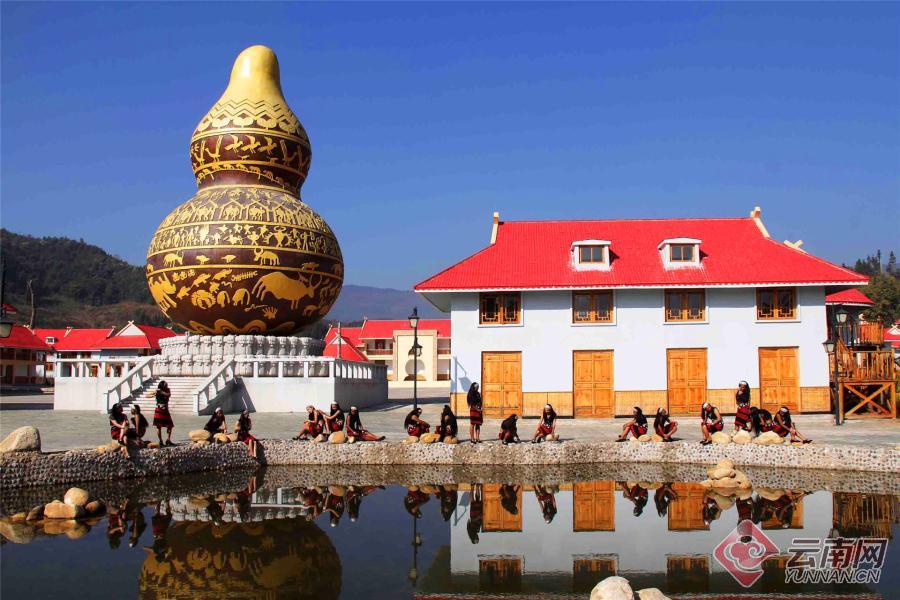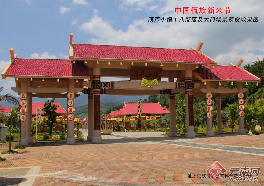 180栋红色弧形屋顶特色民居依山傍水、景色秀美,与12根充满佤文化元素的青石浮雕文化柱、10块佤族神话故事《司岗里传说》和《佤族拉木鼓》活动镂空浮雕文化墙、喷水葫芦、打歌广场、寨心砖、葫芦塔、佤王府餐厅等佤族特色建筑巧妙地融合在一起,全方位展示佤族文化的特色。