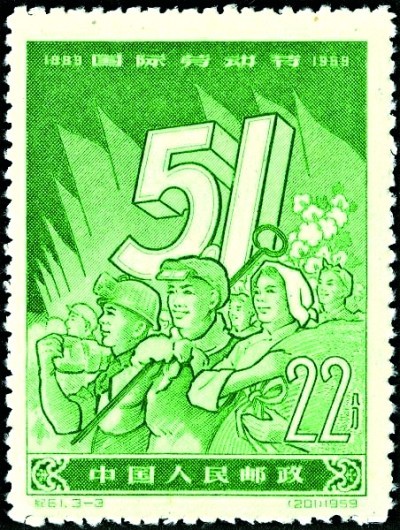 1952年5月1日,新中国成立后的第一套“国际劳动节”纪念邮票面世。全套邮票共3枚,图案分别为:镰刀、铁锤构成的党徽造型与巨大的“1”和横书的“五月”字样;齿轮与放飞和平鸽的手臂;铁锤、烟囱与飞翔的和平鸽。1959年5月1日是“国际劳动节”70周年纪念日,中国人民邮政又发行一套3枚邮票予以隆重纪念,其中一枚邮票图案描绘走在庆祝“五一”劳动节游行队伍前列的煤矿工人、炼钢工人和农妇3人形象(图②),背景中在旗帜和鲜花衬托下的“5.1”字样十分醒目;另一枚邮票图案则描绘以机械工人、知识分子和纺织女工3人为首列的游行队伍,背景中有鲜花簇拥的马克思、列宁头像,该票构图与前述邮票形成相向对称关系,两者共同展现了意气风发、精神愉悦的新中国劳动者欢度自己重大节日的精彩场景;第3枚邮票则以象征多个国家的三只不同肤色的手臂共同握住一枝旗杆插上地球为主图,巨幅旗面上印着大字标语“全世界无产者联合起来!”这两套邮票都是我国著名邮票设计大师孙传哲的作品,雕刻版单色印制,极富时代气息和厚重的年代感,成为“五一”国际劳动节邮票的经典之作。