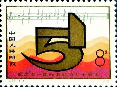 1979年5月1日,为纪念“国际劳动节”90周年,我国又发行一枚构图简洁、内涵丰富、寓意深刻、色彩庄重的“五一”国际劳动节邮票(图①),主图以镰刀、铁锤构成醒目的“5·1”造型,背景图案上方选用了一段《国际歌》乐谱,下方则以色彩渐变的水波纹象征各种旗帜汇成的旗海和人群,设计构思巧妙,具象与抽象结合,充满节日喜庆气氛和时代特色。