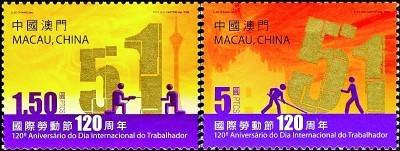 我国澳门特区于2009年5月1日发行一套两枚《国际劳动节120周年》纪念邮票(图④)和一枚小型张,图案中醒目的“5·1”字样由多种形状的建筑构件巧妙搭配而成,其周边配以不同姿态的人形标识,象征从事各种操作的劳动者,背景分别配以澳门地标建筑——旅游塔和大三巴牌坊在朝霞映照下的剪影,设计风格既体现前卫、简练的现代气息,又具本土传统人文历史特色。这是澳门特区第一套“五一”劳动节邮票,也是港澳两个特别行政区迄今发行的唯一一套此类题材邮票。