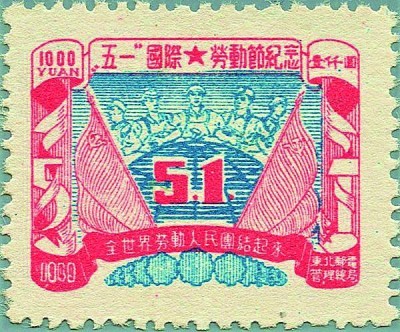 1946年5月1日,我国东北旅大解放区的邮政机构克服战争时期条件简陋等各种困难,在库存作废的伪满邮票上加盖“五一劳动节”等字样,发行了一套3枚不同面值的邮票,成为我国最早的“五一”节邮票。同一天,在遥远欧洲的罗马尼亚也发行了一套5枚“五一国际劳动节”纪念邮票,图案为不同工种的工人、农民和知识分子。由此,中、罗这两套邮票并列成为世界第一套“五一”节邮票。