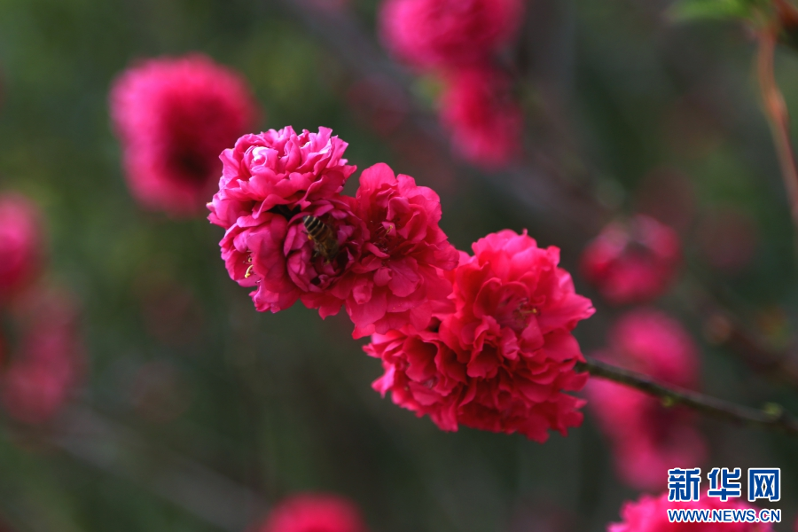 蜜蜂在盛开的桃花里采花蜜(3月17日摄)。新华网发(汪朗 摄)