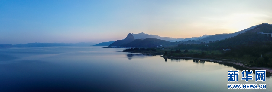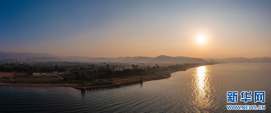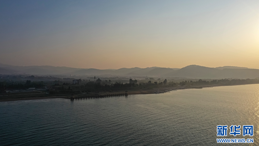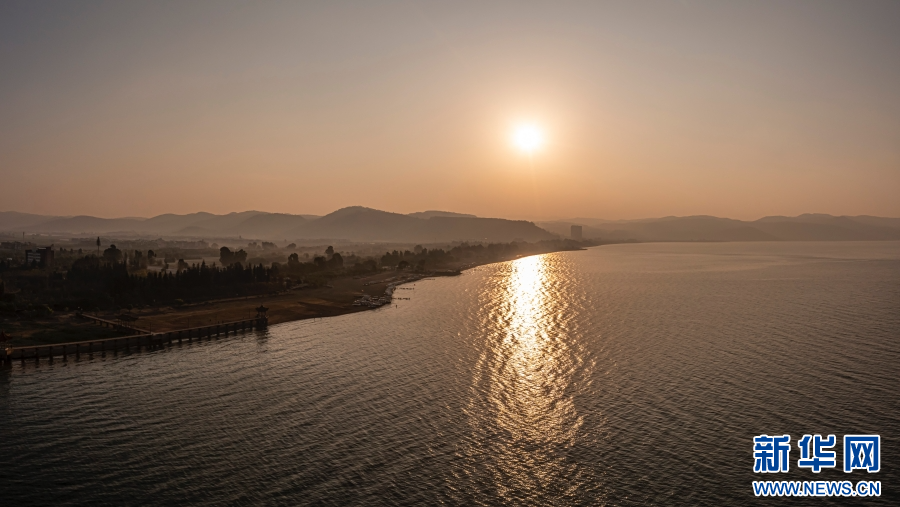 航拍抚仙湖日出(4月4日摄)。新华网发(杨洪龙 摄)