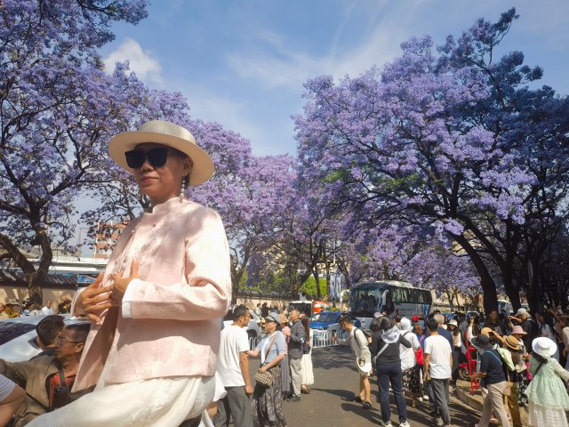 这里每一株蓝花楹都是一道亮丽的风景,一株株的蓝花楹连在一起,便成了一片蓝紫色的“海洋”,蔚为壮观。前来赏花的人很多,到处可见人们拍照的身影。商家们在街道两旁经营着各种生意,十分热闹。