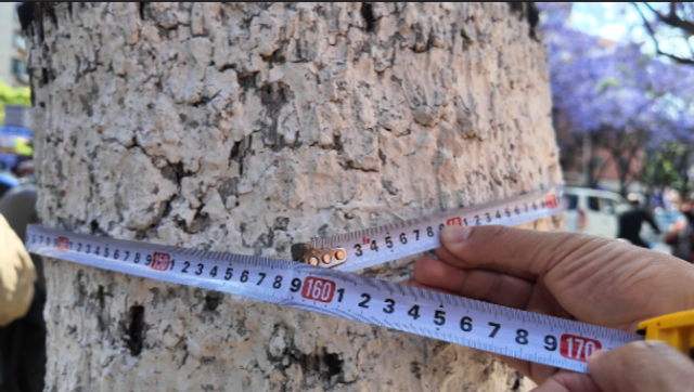为了测量这里的蓝花楹长势如何,记者找到一棵比较粗壮的,拿出卷尺进行测量——胸径55厘米,腰围160厘米,身高约有10米,冠幅达20平方米左右,很是健康。其他的蓝花楹高度都差不多,只是胸径要稍小些,但从长势上看,都生机勃勃。