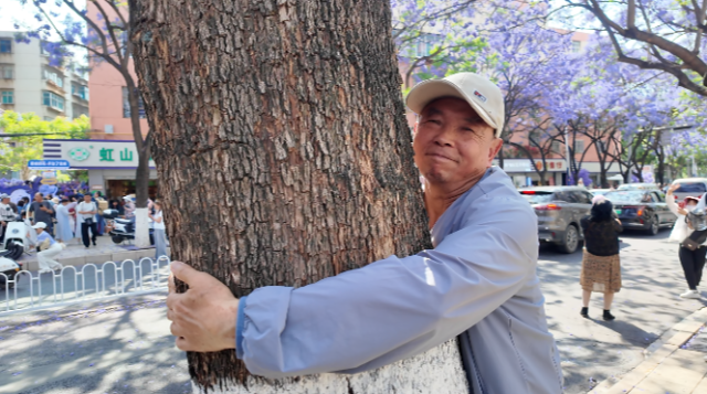 “我来抱一下,看看能不能抱过来。”现场,一位市民看到记者在量树,童心大发,直接就过来抱树。“遗憾”的是,他张开的双臂无法围抱这棵粗壮的蓝花楹,“败”下阵来。