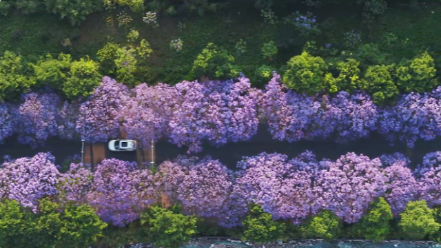 满城春色半城紫,但见蓝楹花满枝。仿佛在一夜之间,昆明娇媚的粉色樱潮就变成了蓝紫色花海。蓝天白云下,一朵朵小喇叭似的蓝紫色花朵挂满树枝,团团簇簇、层层叠叠,随风散落下的花瓣就像是蓝紫色的瀑布,征服着每一个人。这就是蓝花楹,一种充满浪漫、神秘气息的花朵,这段时间,它的美图和视频“刷爆”了市民游客的社交平台。