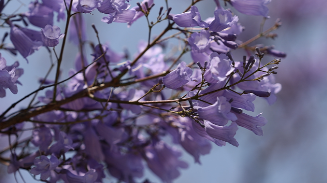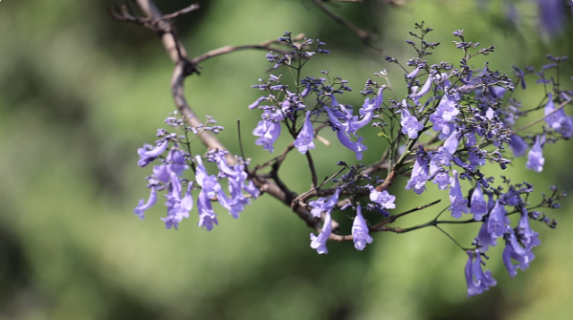 蓝花楹是紫葳科蓝花楹属的落叶乔木,花期为每年的4至6月份,花朵为蓝紫色,可作为景观树孤植,也可以作为行道树栽植。蓝花楹喜温暖湿润、不耐霜雪,昆明独特的气候,让蓝花楹安下了家。在原产地,蓝花楹能开两个多月的花,但是在昆明,一般花期只有一个月左右,比原产地短一些,但这并不妨碍市民游客对蓝花楹的喜爱。蓝花楹的花语是“宁静、深远、忧郁,在绝望中等待爱情”,更给人一种浪漫之感。