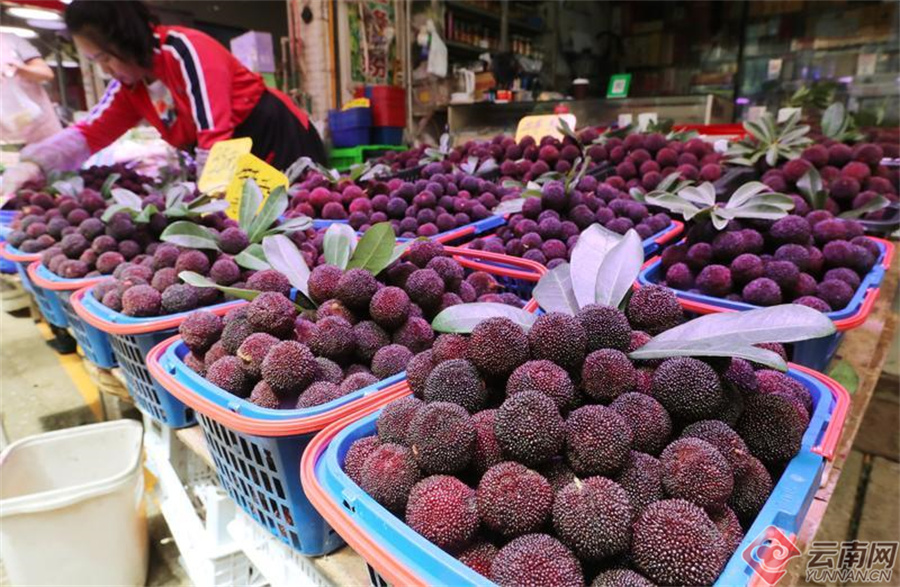 在大观篆新农贸市场,产自红河石屏的大杨梅圆润饱满、酸甜可口,量增价跌。