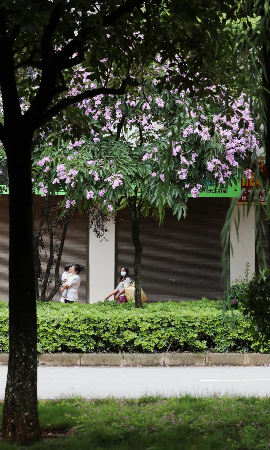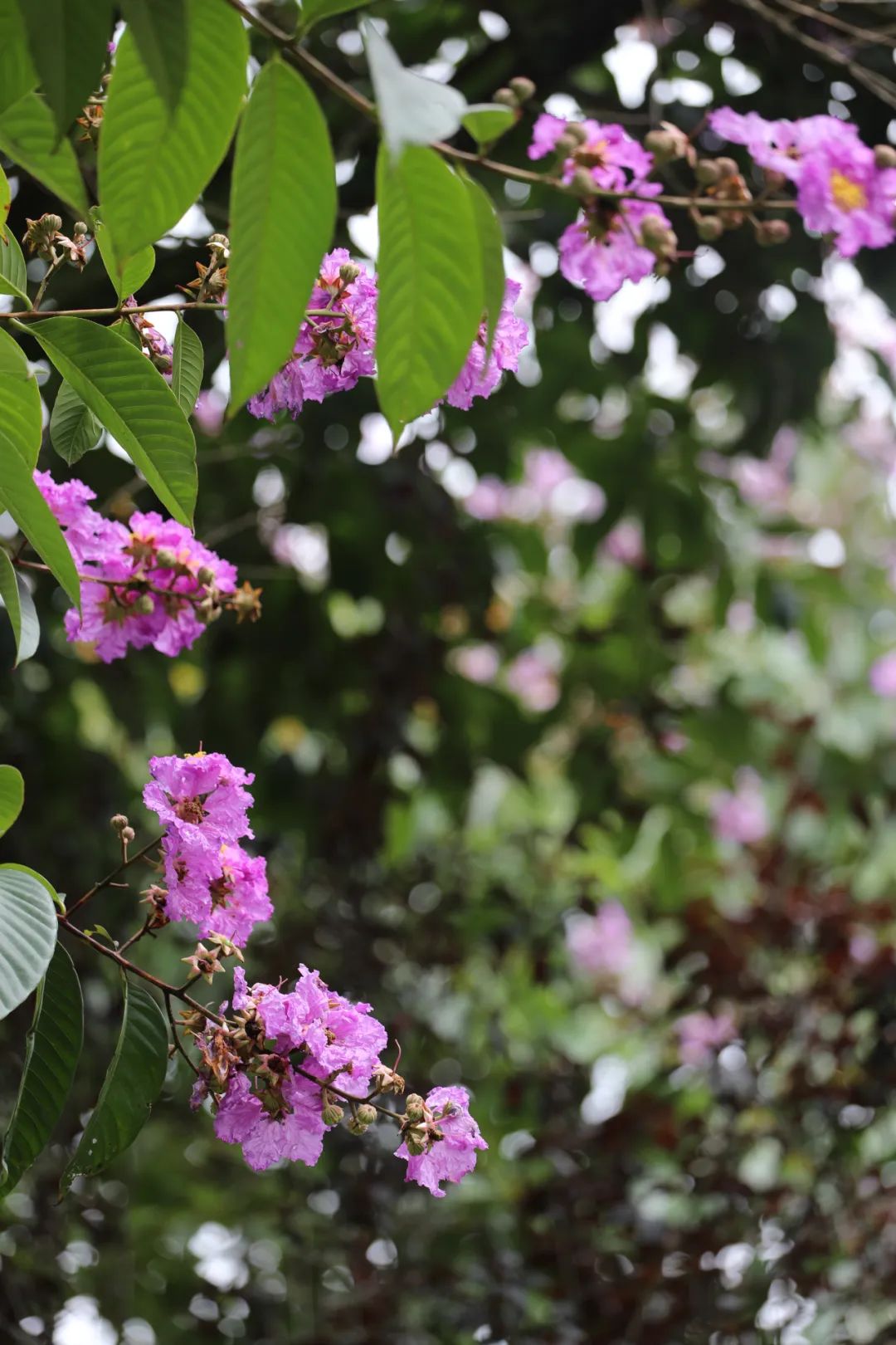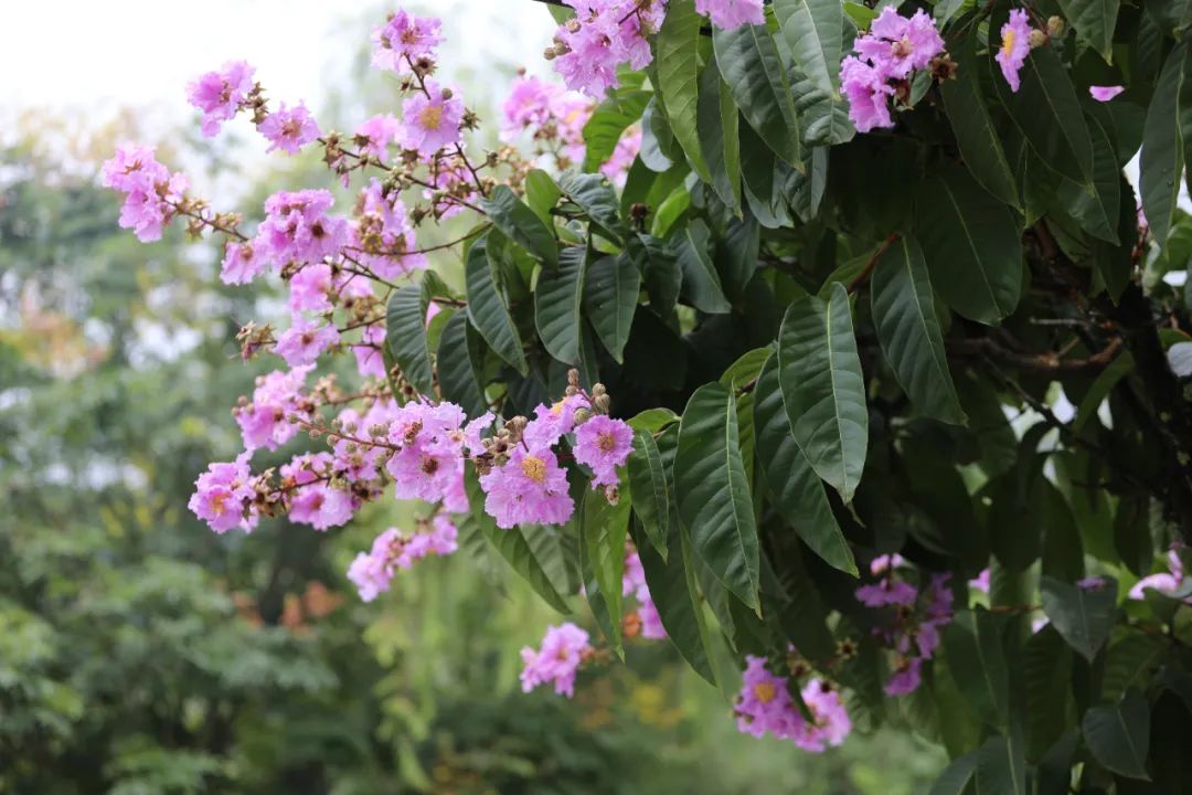 大花紫薇多分布于低海拔湿润地带,属阳性树种,喜高温湿润的气候环境,耐寒耐旱。宁洱气候条件优越,适合多种绿化树木种植,大花紫薇在本地茂盛生长,在健康步道旁长久盛开,正值花期。
