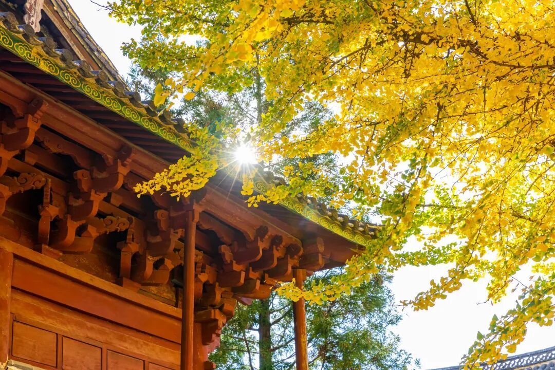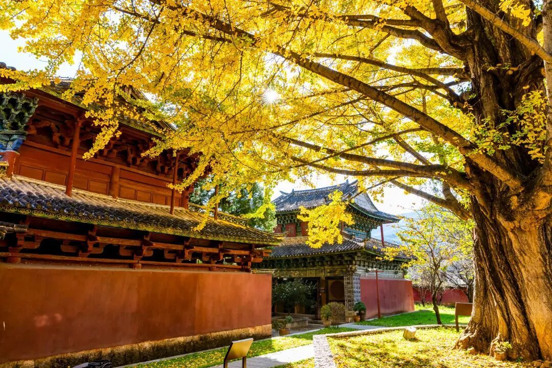 秋风拂过,银杏叶如蝶飞舞,落在石板路上,飘过壁画前,美得让人窒息。这个时候,坐在树下,看光影透过金黄叶片,在古老的壁画上跳跃舞动,你会瞬间读懂什么是“一瞬千年”。