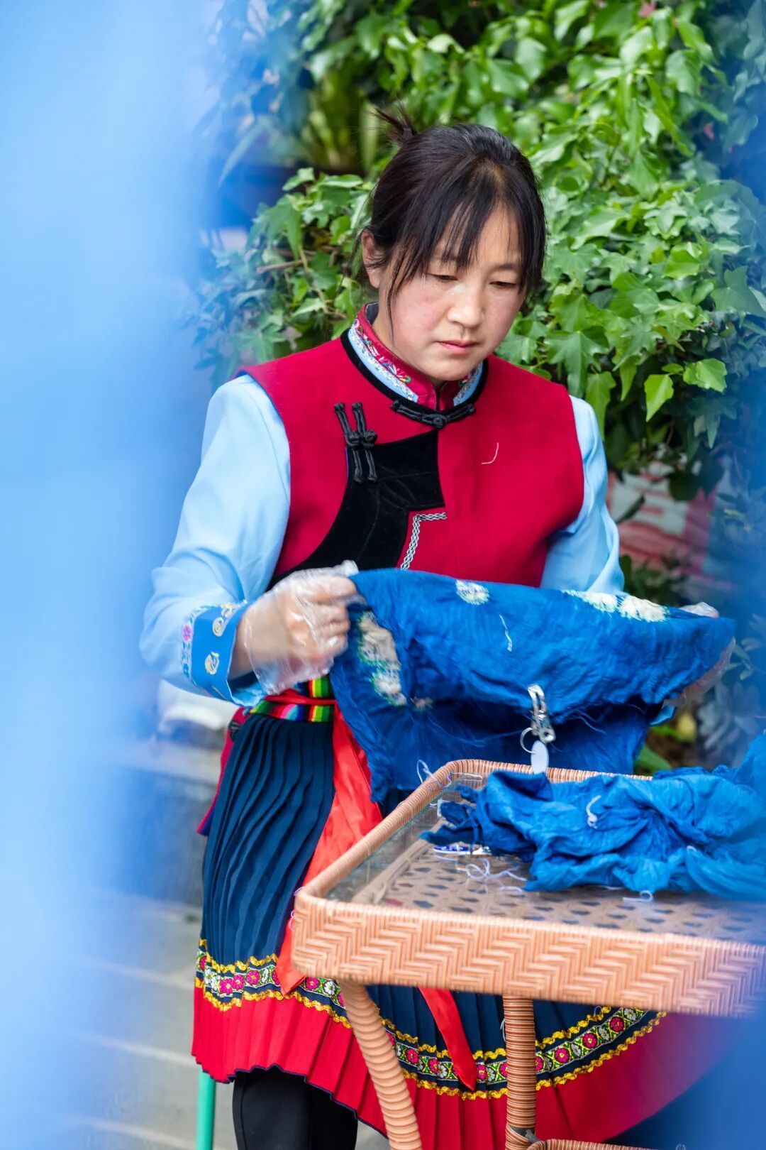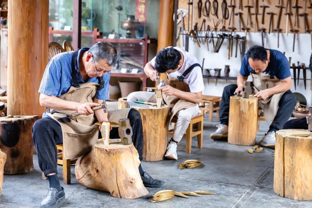 当你从壁画殿宇间走出,白沙的文化馈赠远未结束。漫步古镇街巷,你会发现这里还是一个非遗殿堂——手艺人正一针一线地绣着纳西刺绣,每一针都传承着民族的审美与智慧;铜匠铺里传来清脆的敲打声,制铜工艺在匠人手中焕发新生;染坊里,匠人们将白布通过不同的捆扎方式浸入染缸,拆开绳索的那一刻,一幅幅独一无二的图案跃然布上,每一道纹路都诉说着纳西人对自然与生活的理解。