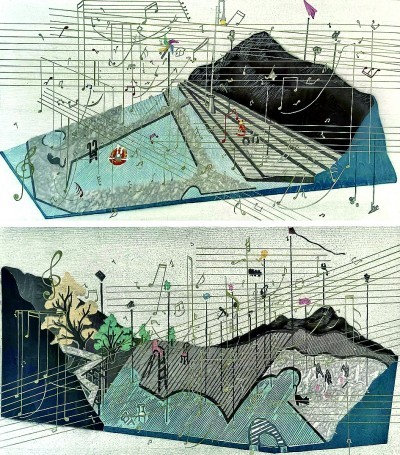 除了对水与色特性的巧妙运用,有的艺术家还另辟蹊径,借助木板的天然肌理为画面带来丰富的质感表现。如绘本《飞跃山海》中有多幅表现山水景致的插图。其中一幅画面的主要视觉元素为天空、山脉和山间的一座古塔,虽构图简约,却呈现出丰富的层次感,只因创作者在质感的塑造上下足了功夫。创作之初,艺术家对多种木材进行了对比实验,最终选取了椴木板与水曲柳木板作为刻版材料。在表现天空时,打磨平整的椴木板上的波浪状肌理被压印在纸面,若隐若现,似水波又似云雾,营造出通透、空灵的意境。而在塑造山脉时,艺术家则采用水曲柳木板进行印制,干涩、锋利的纵向肌理恰如其分地表现出山脉的险峻与雄奇。由此,简单的画面呈现出质朴而深邃的美感,让观者从中感受到大自然的鬼斧神工与艺术家的匠心独运。