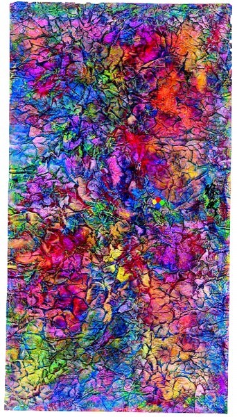 春采甘露,夏携新雨,秋含风沙,冬化晴雪。融色之水,多取于自然之物。百色入洗挥毫而泼之,水色交融如瀑而泄之,遇古老之宣纸,顿肌理万般浮现,层层叠染,一层一变,气象万千,整个画面气韵非常,脱尽前人笔意。