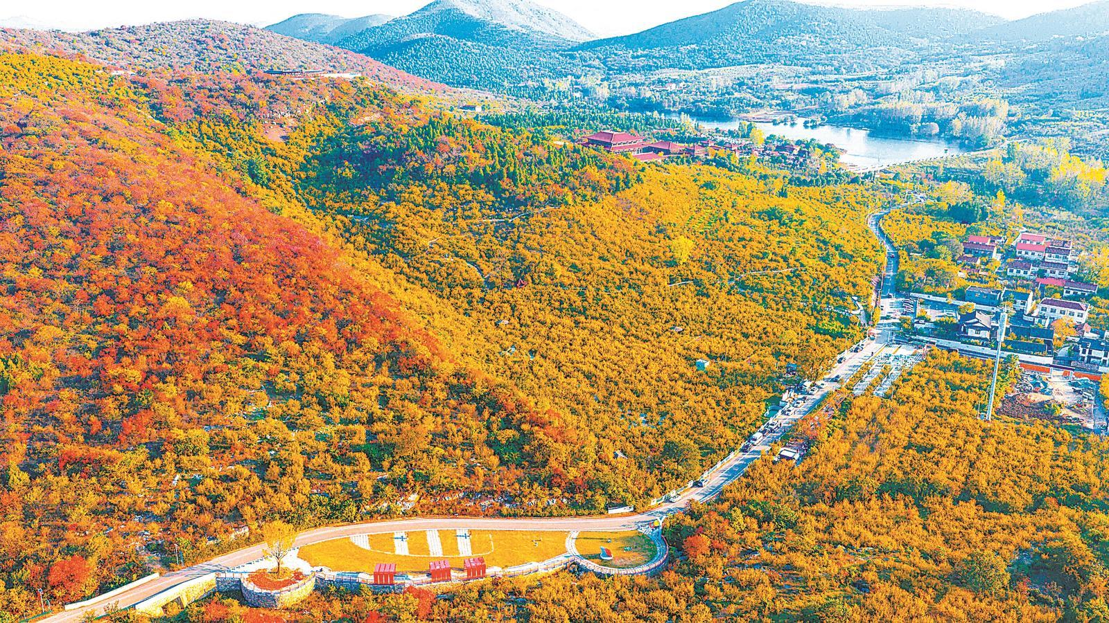 11月2日航拍的淮北市烈山区烈山镇榴园村景色。深秋时节,当地层林尽染,金黄的石榴园与远处的村庄、公路、湖水相映成趣,构成一幅美丽乡村画卷,吸引众多游客前来赏景游玩。(通讯员 张伟)