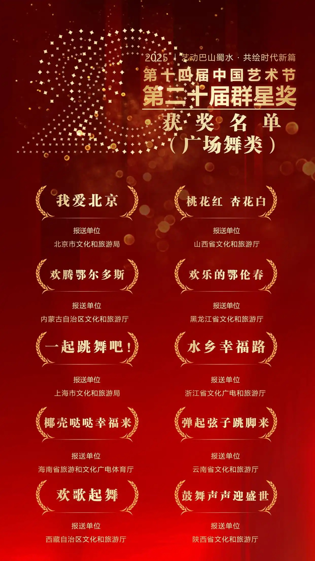 作为中国群众文艺领域的最高政府奖,本届群星奖共有1996个演出单位的5039个作品(团队)、29.5万群众文艺工作者参评,经过初选、复评及终评,最终从全国报送的数千部作品中评选出60个获奖作品(团队),音乐、舞蹈、戏剧、曲艺、广场舞、群众合唱各10个。(刘桂秋)