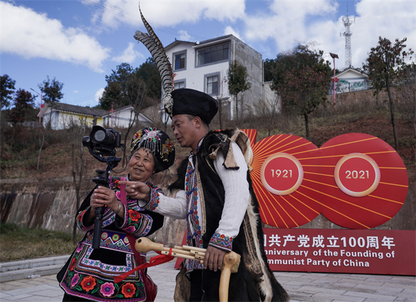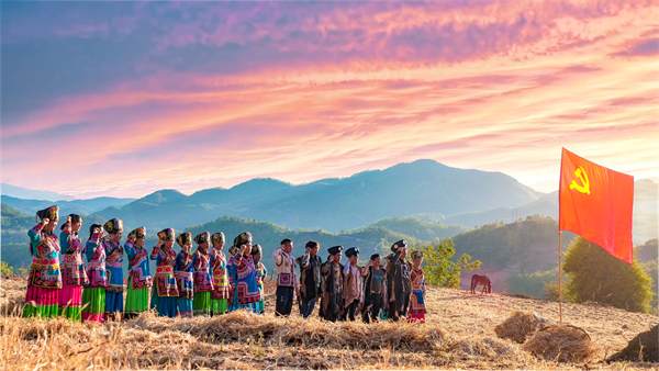 在构图的巧思里,赵月华将“创造美”的精髓——“用思想勾勒画面轮廓,以减法手段雕琢出主体鲜明的叙事景别”——演绎得淋漓尽致。他从不在画面中刻意堆砌民族元素,而是像一位严谨的编剧,以“关系叙事”为核心,果断剔除干扰视觉的冗余细节,让文化内核在留白与聚焦的平衡中自然凸显。比如拍摄禄劝杉乐村傈僳族建党节活动时,他刻意简化背景的繁杂景象,以绚烂彩霞为背景,仅将身着色彩绚丽民族服饰的人物与鲜红的党旗作为画面核心,再以开阔的全景构图缓缓铺陈。无需过多言语,“民族团结跟党走”的主题便在简洁的画面里愈发鲜明,传递出深厚的情感与坚定的信仰力量。