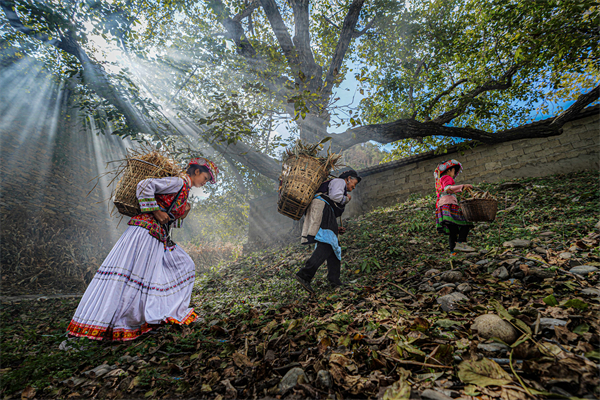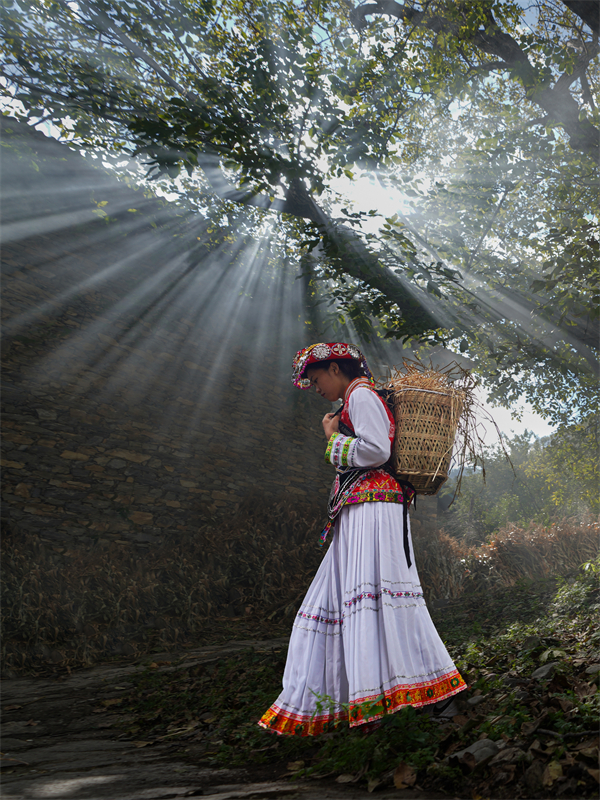 光影于赵月华而言,是影像最动人的“无声台词”,而支撑这份台词的,正是“发现美”的敏锐洞察力。他曾说:“作为影像工作者,最先要做的,是让眼睛成为捕捉美的‘探测器’,在寻常视角里找到那些藏着故事的光影韵律。”拍摄傈僳族传统服饰时,他巧妙采用逆光:光线从人物后上方温柔洒落,穿过核桃树茂密的枝叶,在服饰上晕开一层柔和的光晕,既让纹样如浮雕般立体鲜活,也将民族迁徙路上的风霜与厚重,悄悄藏进衣料的肌理;记录丽江傈僳族火塘节时,他让火塘跳动的红色光斑自然融入画面,灵动的光线中,父亲与女儿的身影在构图里相映成趣,既还原了节日的烟火气,又以光影纵深让静态画面有了动态场景般的“呼吸感”;定格迪庆晨雾中的木楞房时,他敏锐捕捉到晨雾柔化光线的朦胧美感,再用反光板为门窗局部轻轻补光,让光线透过窗棂在屋内织出斑驳光斑,虚实交织间,“人在景中居,景随光流动”的高原诗意缓缓流淌,引人沉醉。