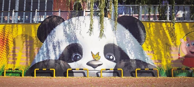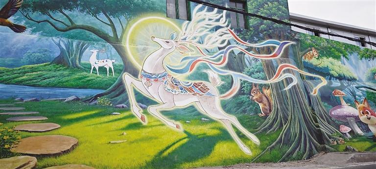 这些色彩斑斓的墙绘以城关区深厚的文化底蕴为底色,将民俗风情、自然生态与城市记忆巧妙交织。在伏龙坪街道,一面巨幅“舞狮”墙绘气势恢宏,红黄相间的狮子昂首腾跃;在山间步道旁,“九色鹿”悠然立于云雾之间,灵动双眸映照山河,将敦煌文化的神秘与自然之美娓娓道来。