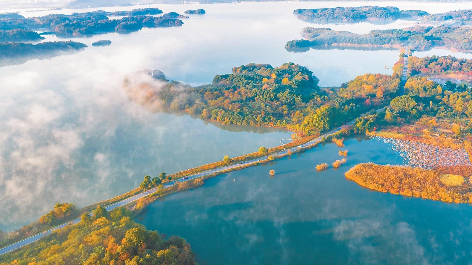 日前,池州市平天湖风景区,湖光山色,五彩斑斓,如镜的湖面衬映着多彩岛屿,如诗如画。近年来,平天湖风景区大力加强水生态修复和湿地保护工作,不断改善景区生态环境,让风景区成为时时宜游、人人乐享的好去处。(通讯员 何清)