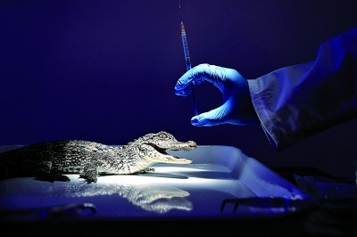 安徽扬子鳄国家级自然保护区工作人员对生病的幼鳄进行治疗。