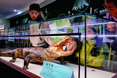 孩子们在扬子鳄主题宣教馆观看扬子鳄标本。