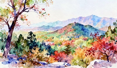 此刻,孩子早已跑向那片绚烂的缓坡,笑声惊起几只山雀。我则寻了块背风的岩石坐下,拿出便携式水彩工具,在速写纸上追赶这动人的光影。水色交融间,深浅不一的红黄在纸上氤氲渗透,连远处古刹的飞檐也浸染其中。纸面上流动的秋色未必全然写实,却将这瞬间的心绪封存其间。(卓越成 图/文)