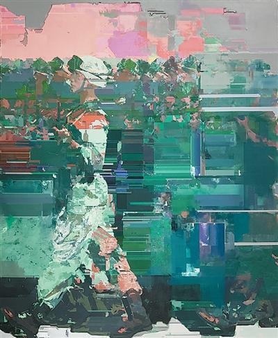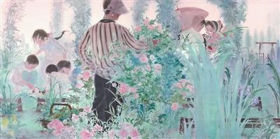 除了对时代命题的关注,青年创作者还表现出对日常生活的关切、对自我内心的观照。程雅嘉中国画《爱之园》(见图一)以工笔和没骨技法,生动描绘园丁修剪花枝、孩童嬉戏、市民流连花园的美好景象;韩建南中国画《彝裳同心石榴红》、李思学油画《迎亲》等,表现了多姿多彩的民俗文化;黄伟超油画《飞鸟》中仿佛向内凝视的青年、斑驳的墙体以及倏忽掠过的飞鸟等意象,构建起一种精神图景,表达作者对远方的向往。
