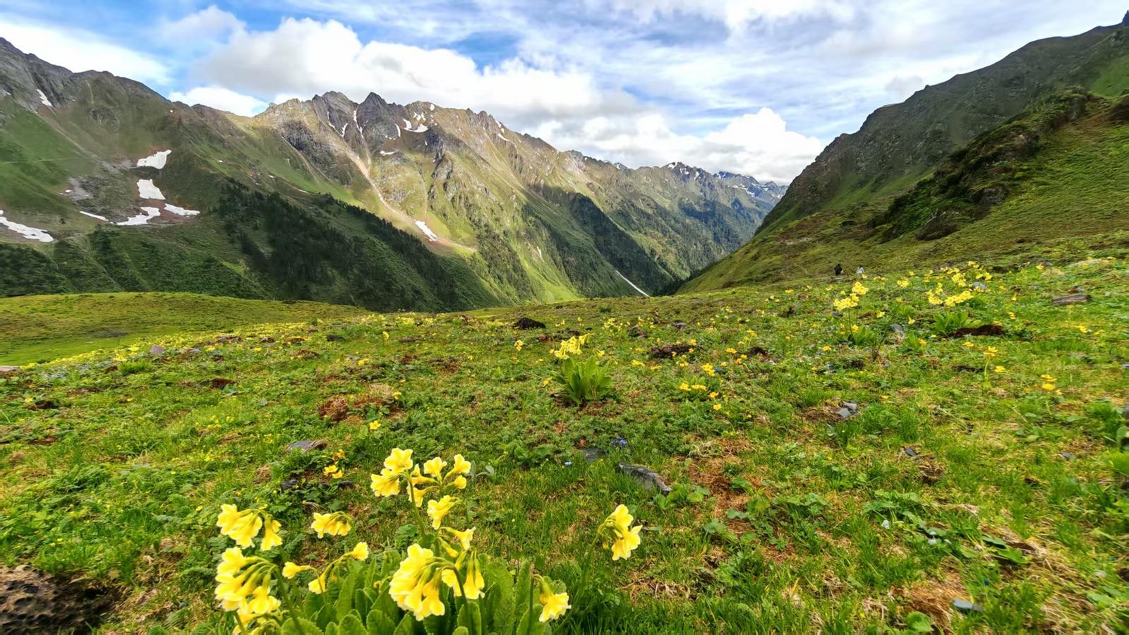 和阿鲁腊卡一样,塞瓦龙巴也有不一样的自然景观。塞瓦龙巴周边分布着众多高山湖泊,如同孔雀山的天心十二湖一样,湖水清澈碧蓝,倒映着雪山与蓝天,构成如诗如画的美景。在这里,碧罗雪山终年积雪,山腰处的高山草甸广袤无垠,穿越原始森林,可欣赏到冷杉、杜鹃等珍稀植物,感受大自然的原始魅力。以前没有公路的时候,要走好几个小时才能抵达。火起来后,性能较好的车子可以抵达牧场附近,方便了许多。从迪麻洛村出发,到白汉洛教堂,经天森云端牧场,最后到塞瓦龙巴大本营,全程约3.7公里。这几天,雪还没有到牧场,秋日的风景金灿灿地映入眼帘,何不去一览呢!塞瓦龙巴的秋日风景还被《人民日报》客户端宣发了,真是美得不得了。
