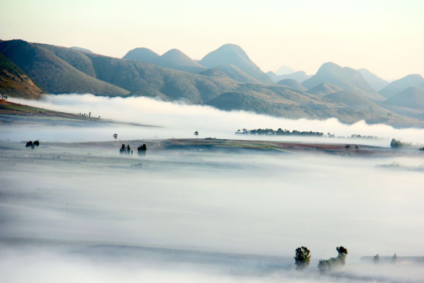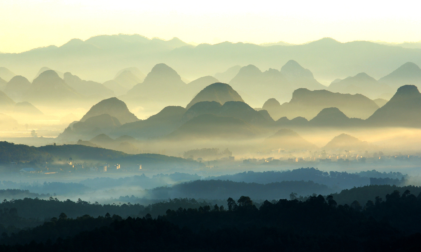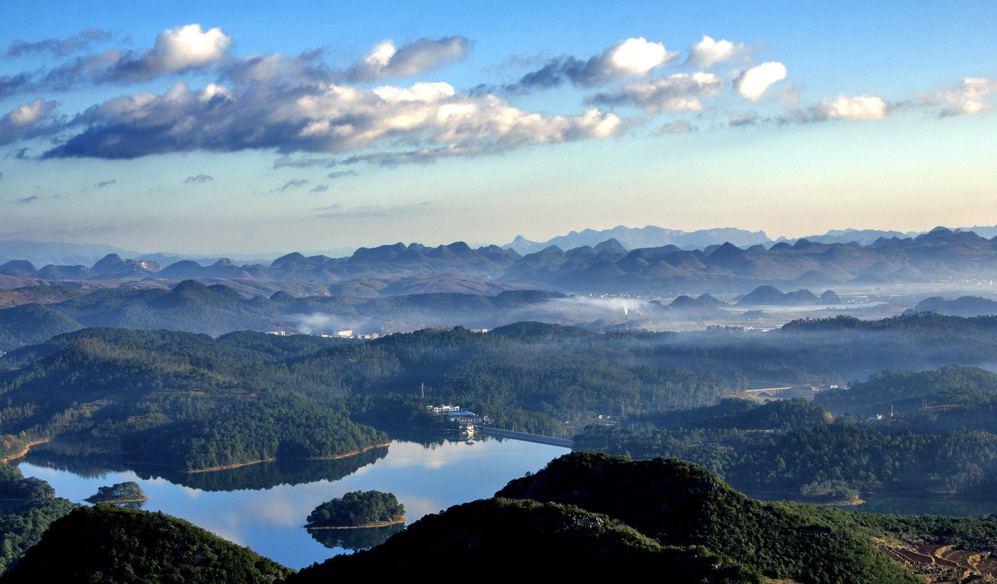薄雾轻笼普者黑湖面,峰峦在云海间若隐若现宛如仙境。