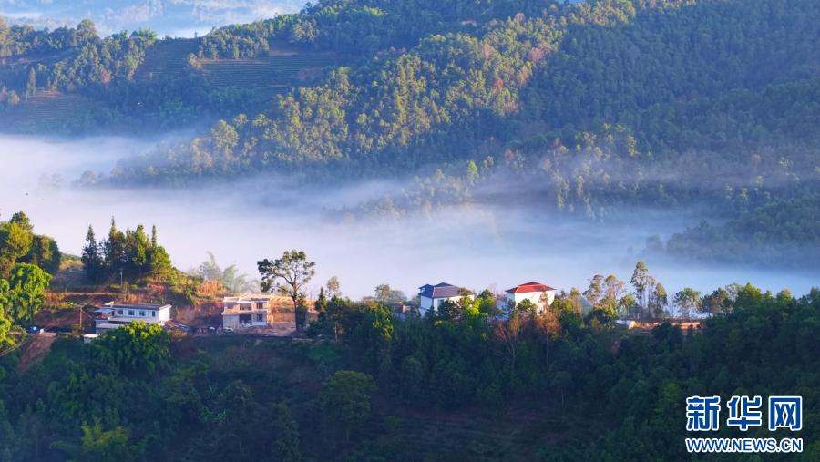 朝阳下的村庄(视频截图)。新华网发(昌宁县融媒体中心供图)