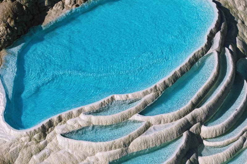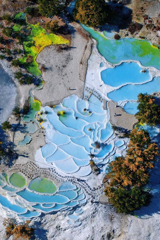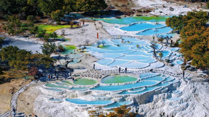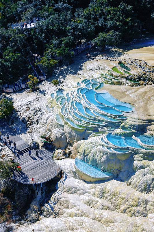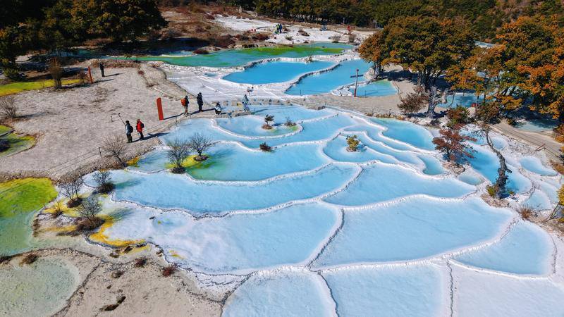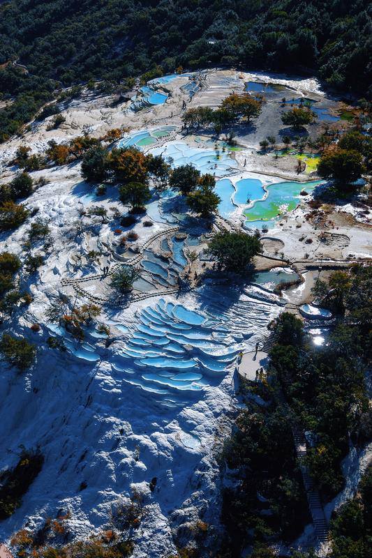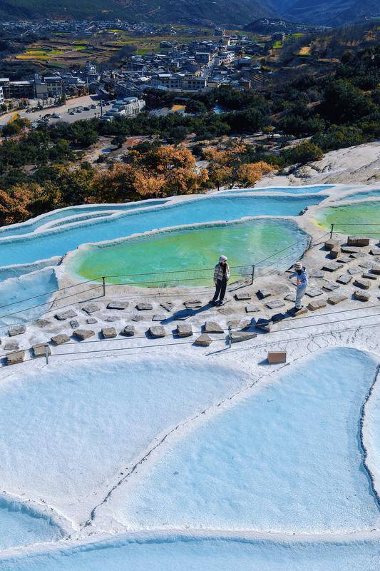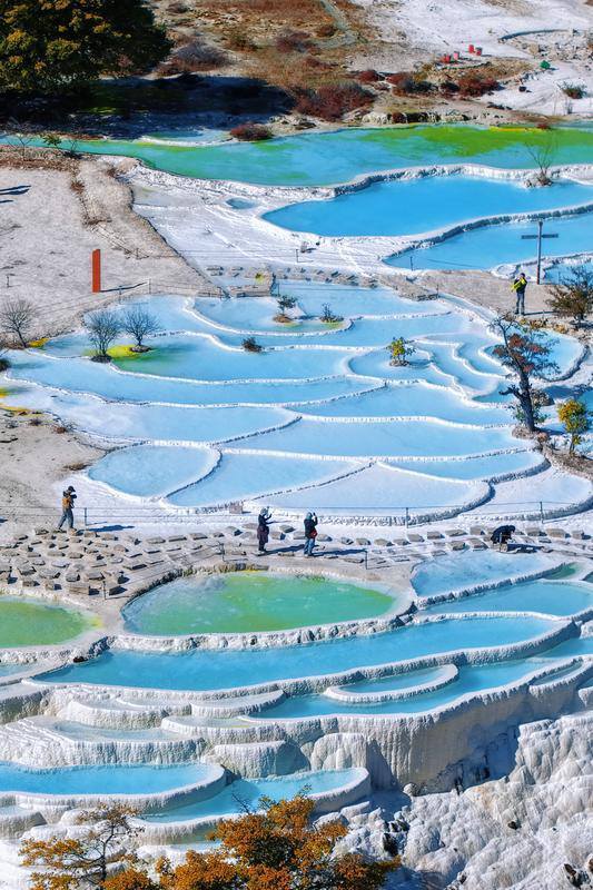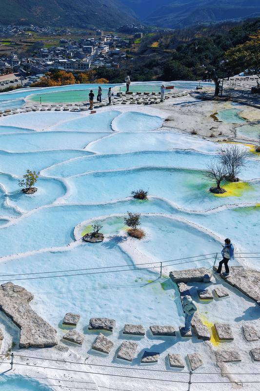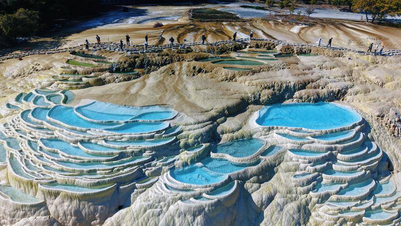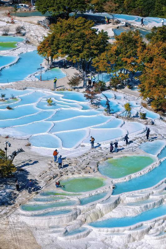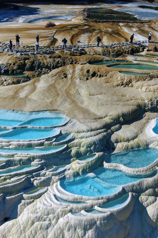 春日阳光下,白水台钙化池泉水呈现出渐变的蓝调。胡妤雅 摄