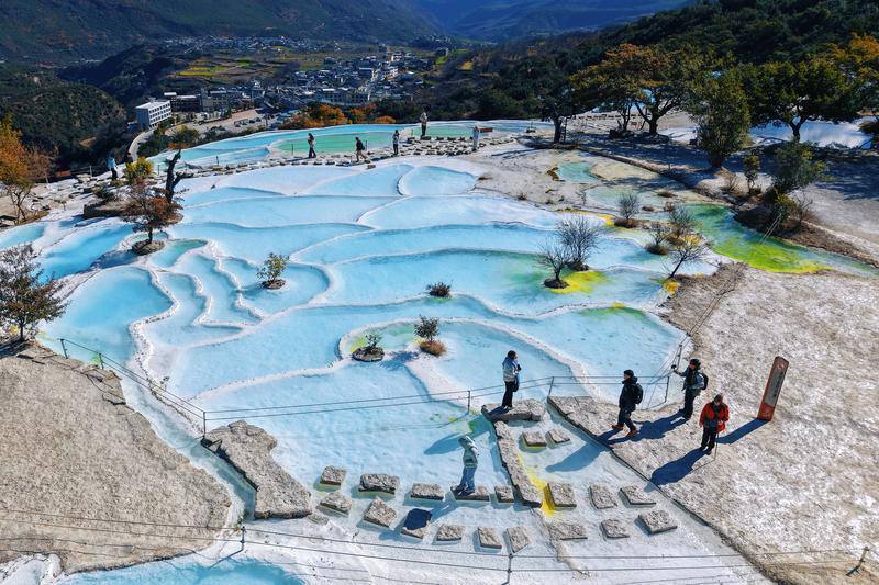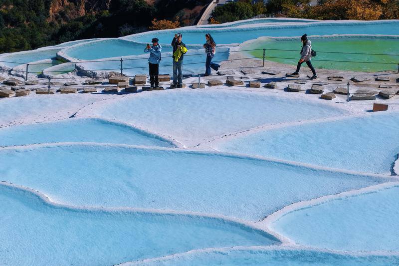 白水台以其清澈的泉水、明媚的光影和层次分明的色彩,持续吸引着各地游客前来旅游观光。胡妤雅 摄