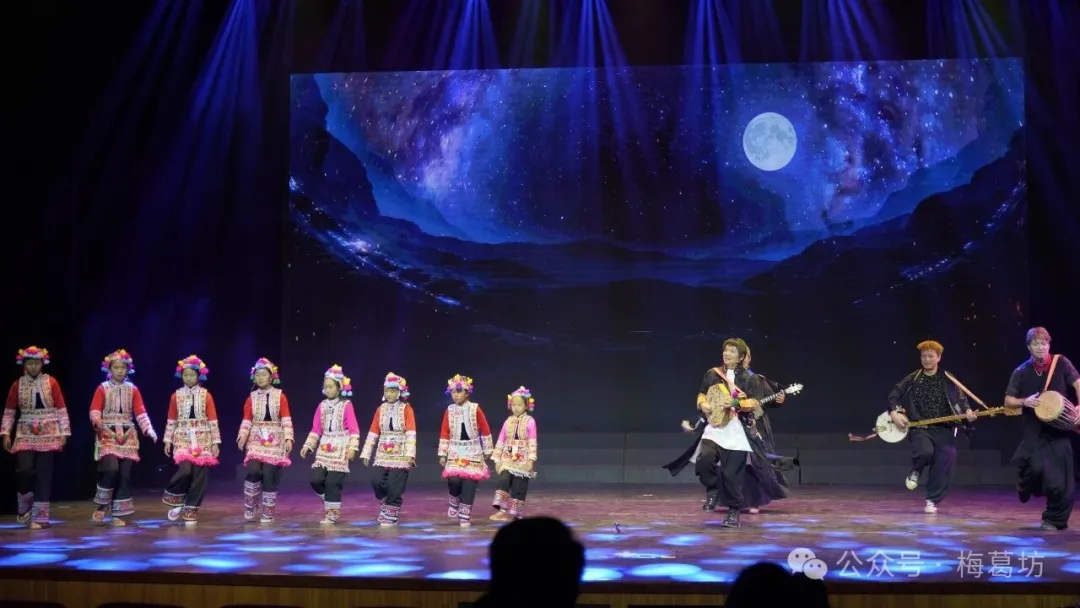 其中,梅葛坊童谣班与山人乐队跨界合作,以童声碰撞原生态摇滚,展示国家级非物质文化遗产“梅葛”的魅力。演出时,孩子们身着彝族服饰登台,唱响童谣《挖木拉》,用纯净嗓音演绎朴素又充满希望的生活场景,带领观众走入彝家山寨。乐队成员默契配合,以简约伴奏烘托童声,主唱互动、打击乐手控节奏,将摇滚与童谣融合。