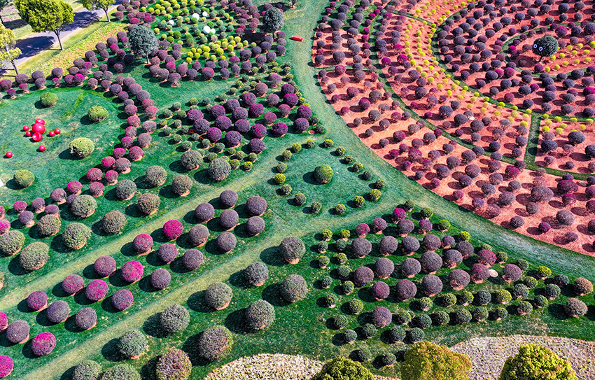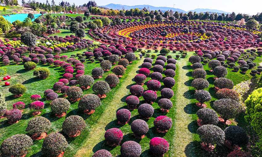 红花继木球、红叶石楠球、胡椒木球、九里香球……春节以来,在云南省红河哈尼族彝族自治州弥勒太平湖森林公园内,一个由10余个种类2000余株绿植球组成的“球球园”,把山野装扮成了一个童话世界,吸引了众多游客打卡拍照。