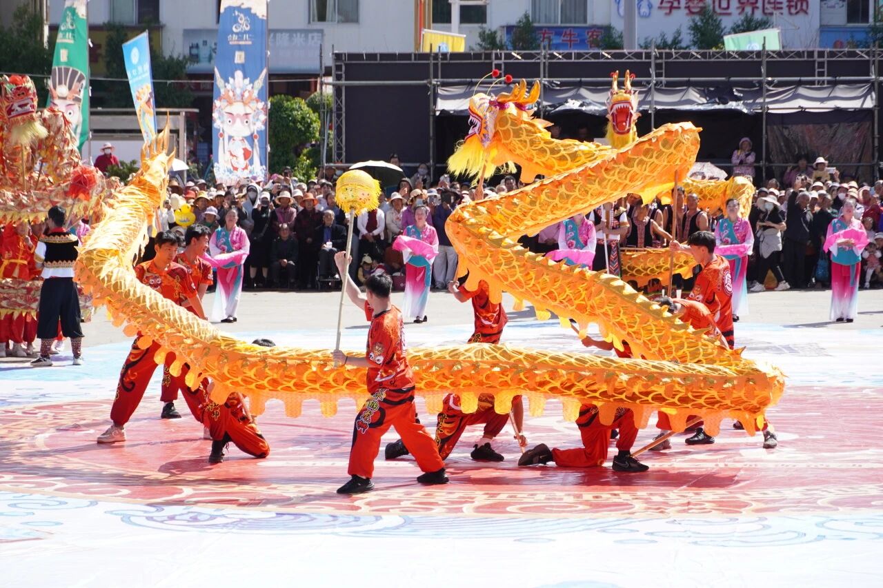 随后,多条栩栩如生的金龙整齐列阵,在龙珠引领下伴着鼓点欢腾起舞,时而腾空翻腾、时而摆尾回旋,犹如蛟龙出海、气势恢宏,精湛的舞龙表演引得现场观众阵阵喝彩,人山人海的广场上掌声、欢呼声此起彼伏,尽显民俗盛会的火热氛围。