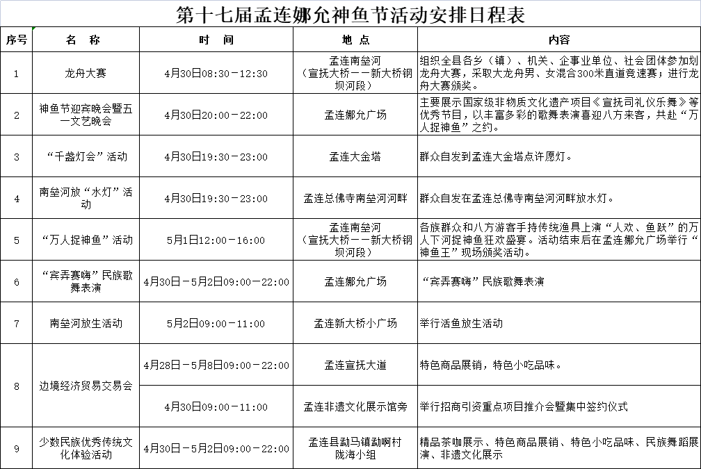 第十七届孟连娜允神鱼节将于4月30日至5月2日在孟连傣族拉祜族佤族自治县举办。本届孟连娜允神鱼节共设置了龙舟大赛、神鱼节迎宾晚会暨五一文艺晚会、“千盏灯会”活动、南垒河放“水灯”活动、“万人捉神鱼”活动、“宾弄赛嗨”民族歌舞表演、南垒河放生活动、边境经济贸易交易会、少数民族优秀传统文化体验活动9项活动。