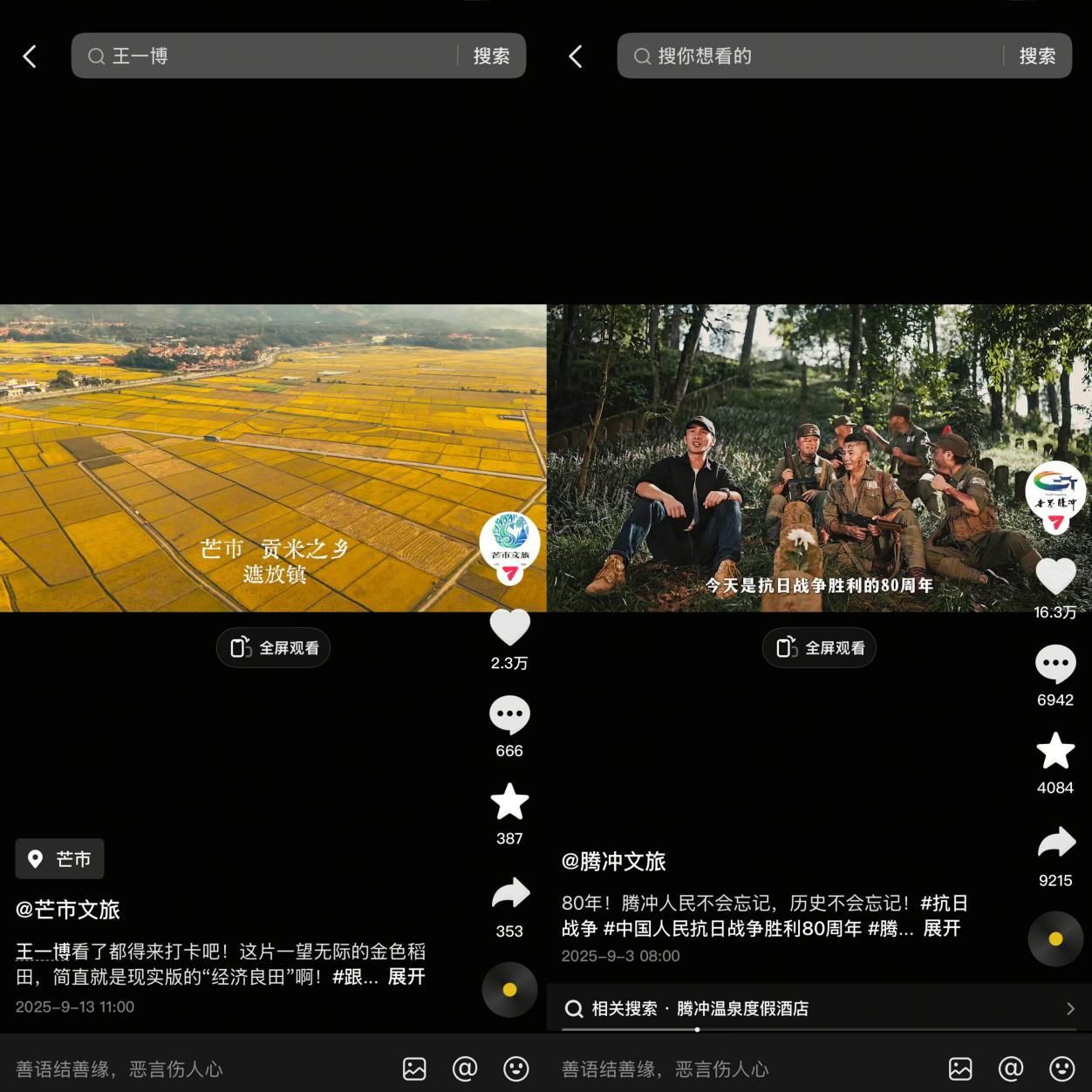 @芒市文旅9月13日发布的“王一博看了都得来打卡吧!这片一望无际的金色稻田,简直就是现实版的‘经济良田’啊!”视频获2.3万赞;@腾冲文旅9月3日发布的“80年!腾冲人民不会忘记,历史不会忘记!”视频获16.3万赞。