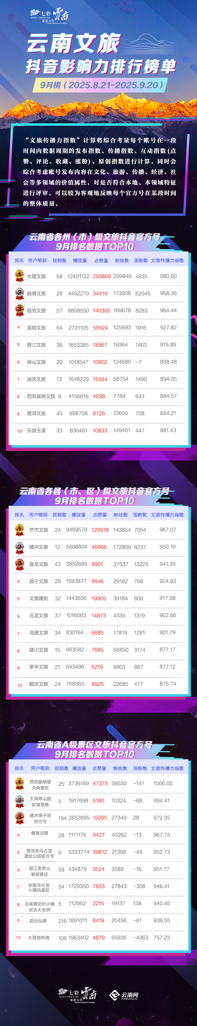 近日,2025年9月云南文旅抖音影响力排行榜正式发布。本期榜单延续三大指数体系:州(市)级文旅抖音官方号传播力指数、县(市、区)级文旅抖音官方号传播力指数、A级旅游景区文旅抖音官方号传播力指数。
