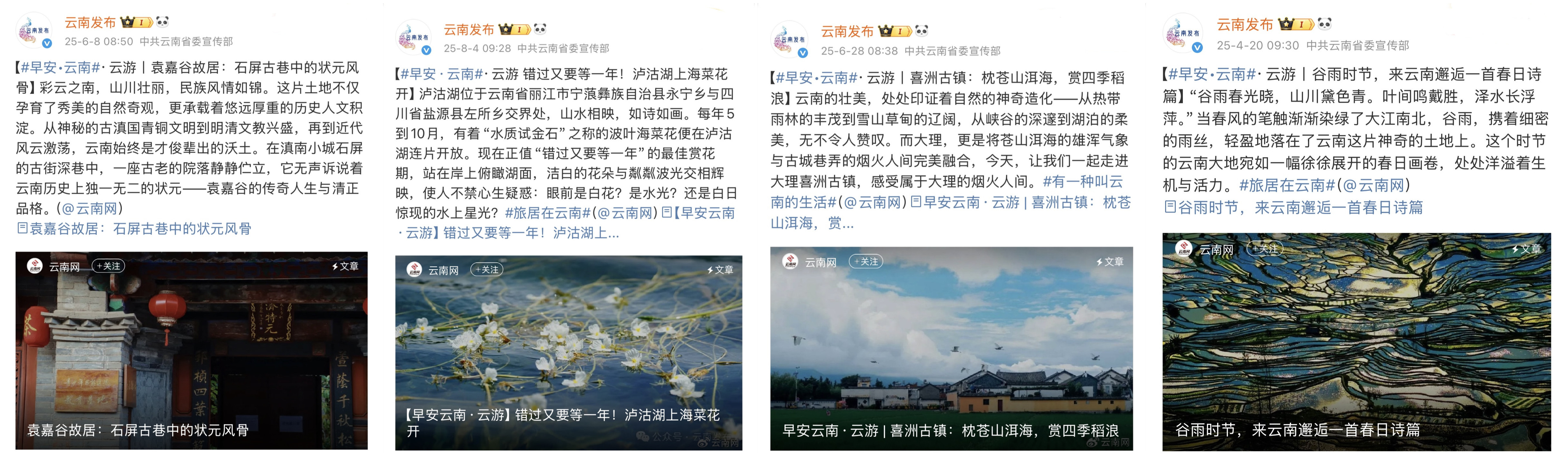 《早安云南》取得的成功,还源于其不断完善的“省级引领、州市响应、全域覆盖”联动传播生态体系,这一模式有效打破了地域和部门的界限,实现了传播资源共振。以《早安云南》为核心品牌,由云南大学的“早安·云大”、云南省博物馆的“早安云博”以及云南各州市相继推出的“早安红河”“早安·大理”等系列话题,在各州市及不同圈层引发广泛共鸣与二次传播,成功编织了一张覆盖全省、多层次、立体化的融媒体传播网络,不仅放大了省级品牌声量,更显著提升了各州市、各类文旅资源的整体曝光度和市场吸引力。