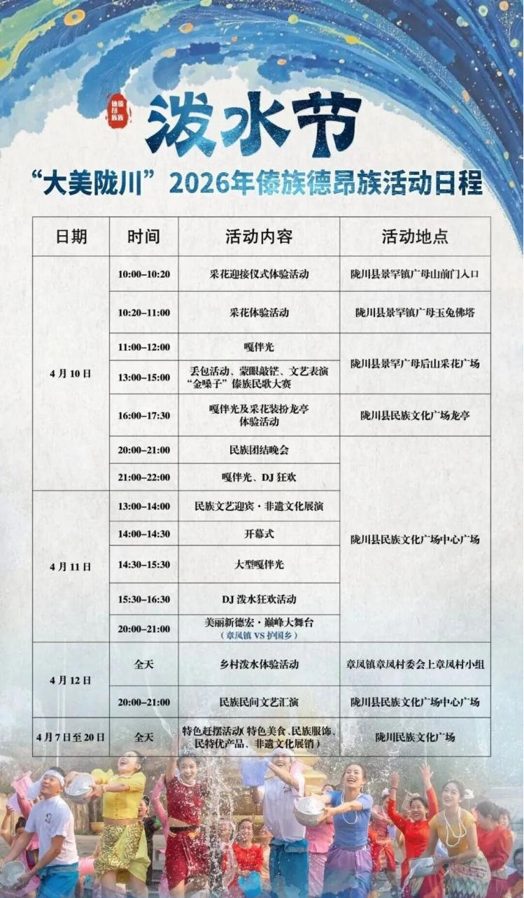 傣族泼水节作为国家级非物质文化遗产代表性项目,是全面展现傣族水文化、音乐舞蹈文化、饮食文化、服饰文化和民间习俗等传统文化的综合性舞台,是“水花里的非遗”,更是游客亲近云南、体验民族风情的绝佳窗口。本篇汇集西双版纳、德宏、临沧、普洱四地官方活动日程,让节庆不再遥远,让非遗触手可及。