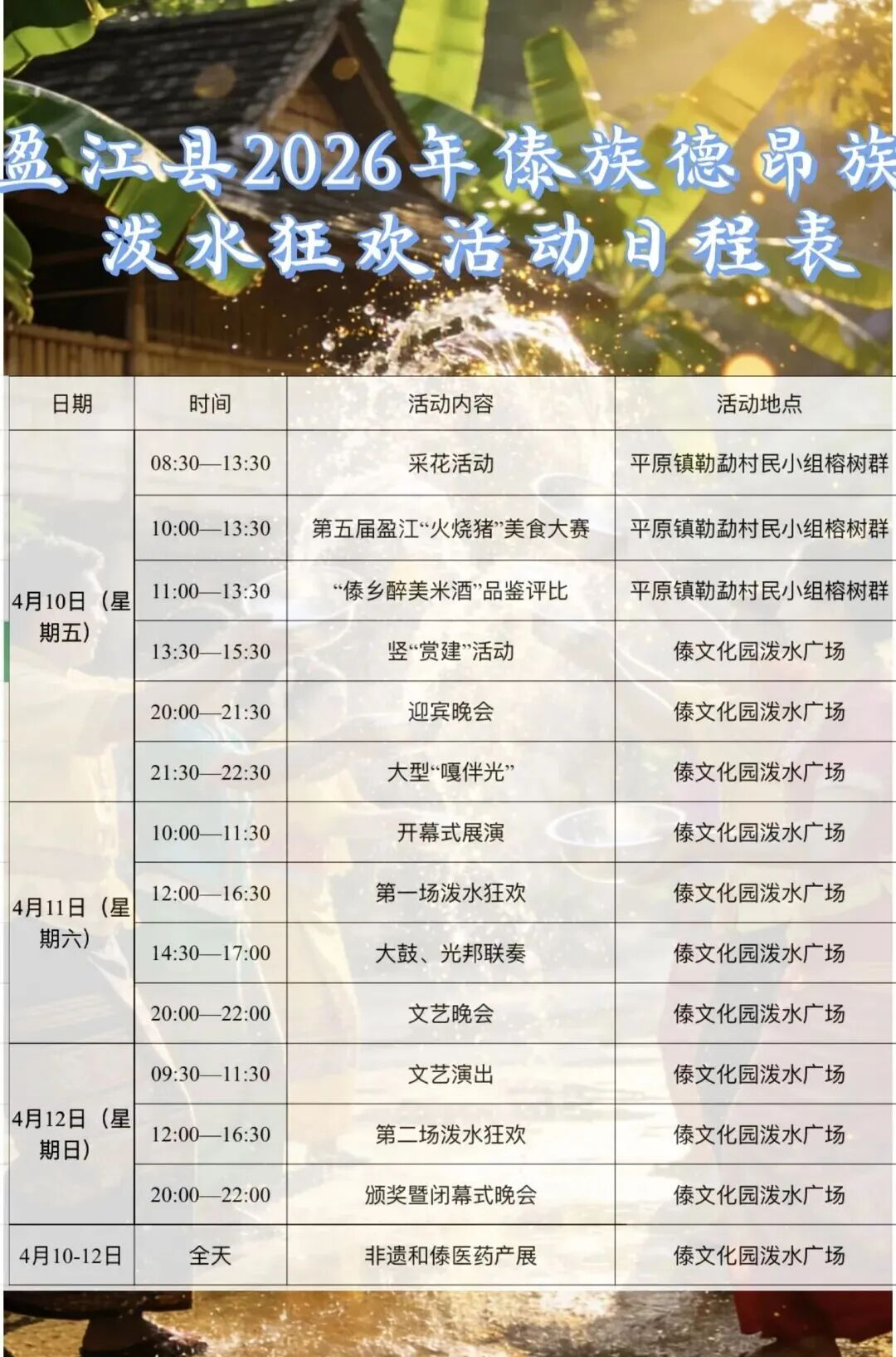 游客可欣赏傣族象脚鼓舞、嘎光舞等传统歌舞展演;还可参与泼水、万人赶摆、放水灯、民族美食市集等活动。